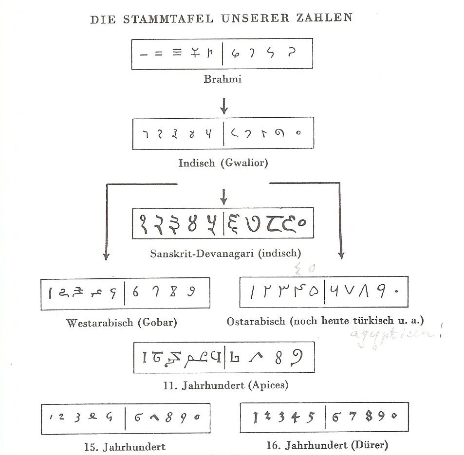Unsere Zahlzeichen oder Ziffern, die ursprünglich aus dem Indischen stammen (insbesondere die 1, 2, 3, 6, 7, 9 und die 0 von der 10; die 8 wurde möglicherweise zentrosymmetrisch zum besseren Erkennen ergänzt), sind nicht die einzigen, wie jeder weiß, der sich zum Beispiel im Urlaub in außereuropäischen Ländern, wie in Ägypten, die Autokennzeichen angesehen hat: