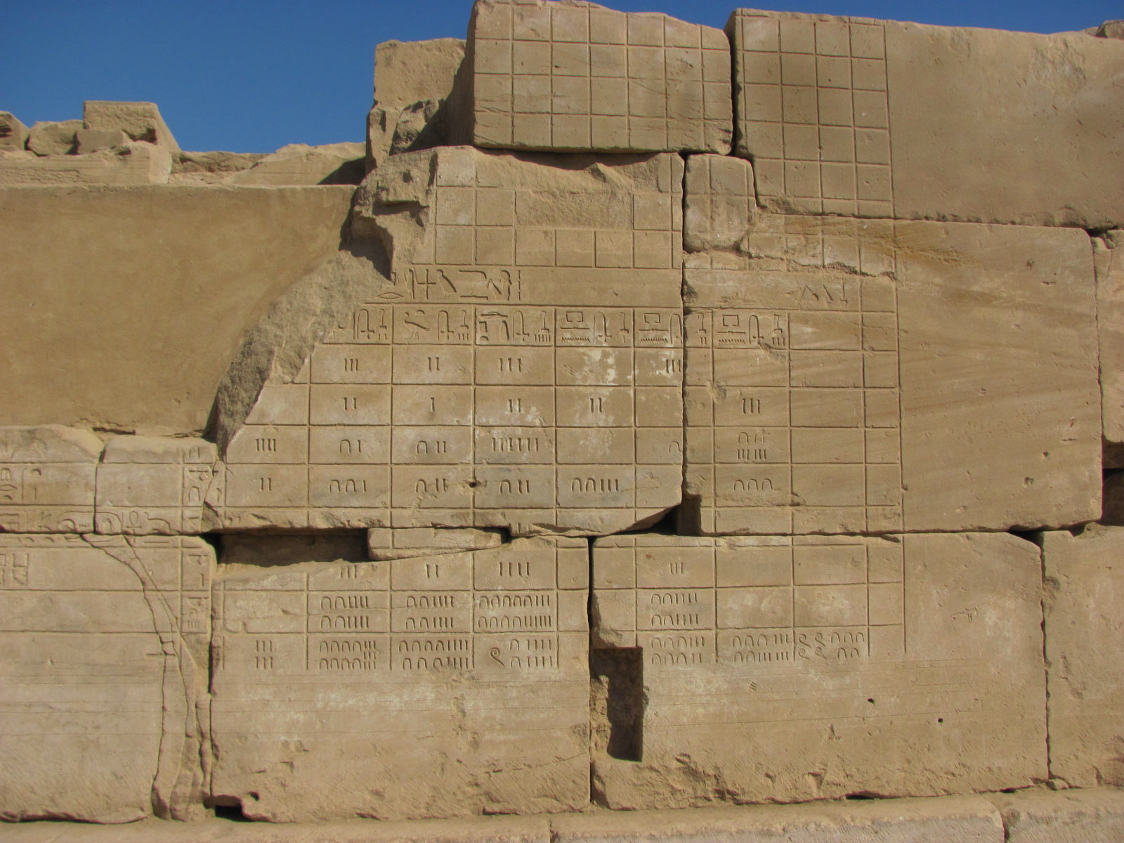 Die Tabelle auf dem Foto (Karnak-Tempel) zeigt in den Spalten Zahlen, deren Summe in der unteren Zeile steht; die Gesamtsumme aus den Einzelsummen ist 450 und steht in dem Kästchen ganz rechts unten.